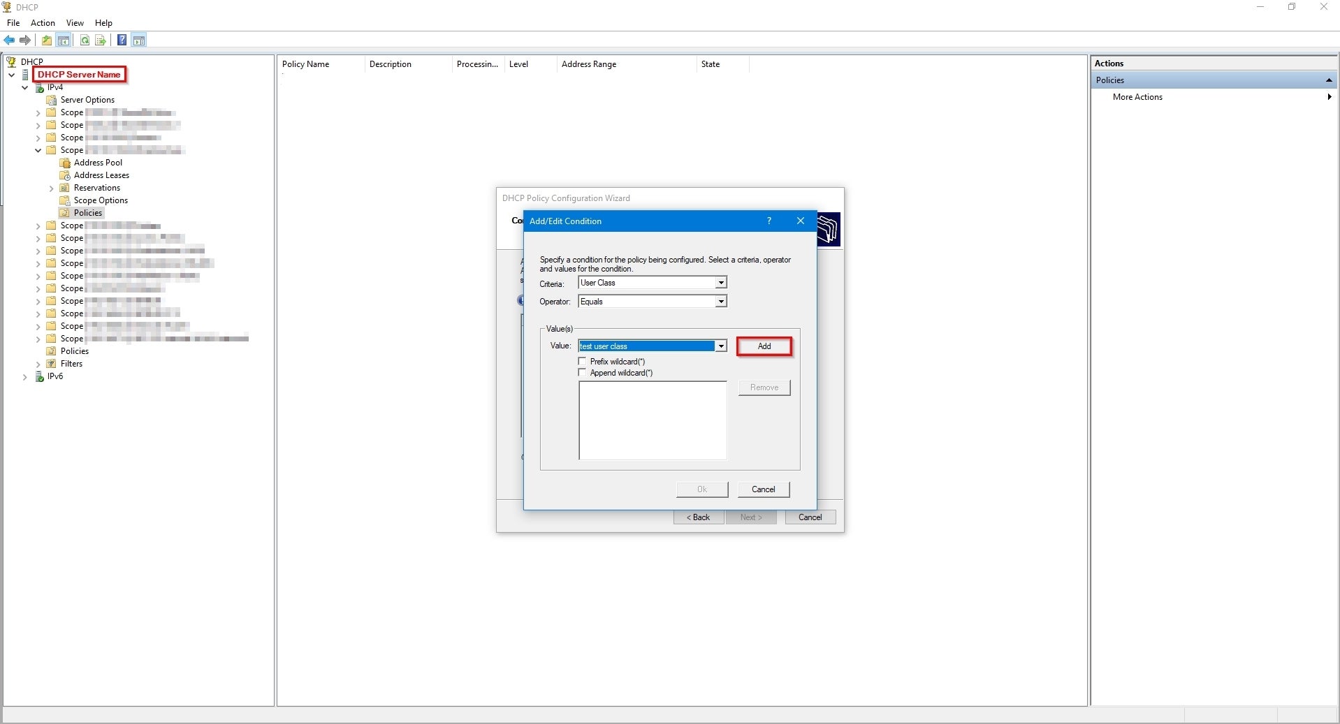 'Scopes' and 'classes' of IP addresses can help to logically organize address ranges by users and devices within Windows DHCP Server. Credit: Collin Anderson Whether in an existing network or a new one, there is an aspect of design that cannot be skipped: deciding if handing out IP addresses will be dynamic (automatic) or manual (one-by-one) or—the most common—a combination of the two. By choosing to distribute them dynamically you are choosing to use a dynamic host configuration protocol (DHCP) service somewhere on your network, and there can be some tricks to that regardless of what server you use. For this discussion, I will describe how to use user classes on a Windows DCHP Server to specify a range of IP addresses and to assign range-specific DHCP options. For background, DHCP is a protocol between server and client with the server automatically providing IP addresses to clients as they join a network rather than the addresses being manually assigned per device. The DHCP role in a network can be performed by different types of hardware (security appliances, L3 switches, DHCP servers), but it doesn’t have to be just one of them; it can be whatever works best for what you are trying to do. A common DHCP setup I use is running the service on a security appliance to host ranges of IP addresses grouped as a subnet for dynamic distribution—scopes—that only need access to the internet, such as guest or IoT networks. Then I run a separate DHCP server to handle devices and scopes within the domain that accesses internal resources. There are many reasons to choose DHCP over static assignment, the biggest being ease of use. In most enterprises there will be at least one DHCP server on the network serving IP addresses from at least one scope to be given out to devices as they connect to the network. Scopes are configurable and can range from two IP addresses to thousands. Microsoft’s DHCP server handles as many scopes as you need and has a pretty simple GUI for setup and management. It also supports subsets of scopes, called classes, to help organize addresses by users and devices in a logical way. User classes and vendor classes allow you to assign DHCP options to groups of clients by specifying policies that will apply to some users or devices but not all of them within the same scope. Classes within scopes can be useful if you want to separate a group of devices to one segment of a scope while still maintaining dynamic hosting. For example, I recently used user classes to assign addresses from a particular scope to SD-WAN users working remotely. Because the network between the DHCP server and the proxy server that set up VPN links to clients was virtual, I used user classes to distinguish the SD-WAN clients from native clients. DHCP user classes and vendor classes alike are identifiers that use a minimum of 1 octet within the IP-address request sent from the DHCP client to the DHCP server. Their purpose is to define policy criteria such as tags that denote class, specific vendor information, or to specify DHCP servers. By using user or vender classes with DHCP policies you can specify types of devices and organize what range they receive IP addresses from within a given scope. There are several ways to use DHCP policies but I will show how to use user classes on a Windows DCHP Server to specify a range and to assign range-specific DHCP options on that class. How to implement user classes To implement user classes you first need to connect to the DHCP server that is in your domain. As long as your DHCP server is a Windows server 2012 or newer, the following steps will apply. First open the DHCP Microsoft Management Console (MMC) snap-in and connect to the server. Once you have it open, right click on the IPv4 icon to access the drop-down menu and click on Define User Classes: Michael A. Flowers Sr. On the “DHCP User Classes” dialog box you will see the existing user classes by name and description. To add a new one simply click on “Add…”. Michael A. Flowers Sr. In the “New Class” dialog box you will need to add the display name, description, and ASCII name of the class. The display name and description are really only for your own organization, but having them describe what you are trying to use the class for may help make it easier to identify them later. The ASCII field is the important area that will act as the actual “tag” for the packets coming to the DHCP server. For this field do not use spaces between the words and be sure to be mindful of case, as it is case sensitive. I have had mixed success with special characters. Some, such as hyphens or underscores, work and others, like pound signs, don’t. I haven’t seen restrictions on use of characters in the Microsoft documentation, so keep that in mind. Be sure to take note of what you put there for later and click “OK” when you are done. The “Binary” field to the left of the ASCII field will auto fill as you fill in the ASCII name. Michael A. Flowers Sr. Once your new user class is added, click “Close” to exit this dialog box. Back at the main DHCP MMC snap-in, expand the scope you will be applying this user class to, right-click on the “Policies” folder, and select “New Policy…” from the drop-down menu. Michael A. Flowers Sr. In the “Policy Name” field enter a name that will make sense to you and your team when you look back on this later. Fill in the “Description” field with what you are aiming to use this policy for. Click “Next”. On the “DHCP Policy Configuration Wizard” click “Add” to add a condition for the policy. Michael A. Flowers Sr. In the “Add/Edit Condition” dialog box, use the drop-down menu to change the “Criteria:” field from Vendor Class to User Class. Michael A. Flowers Sr. Change the “Value:” field to the new user class you just created. Michael A. Flowers Sr. Click the “Add” button when all of your selections are correct. Michae